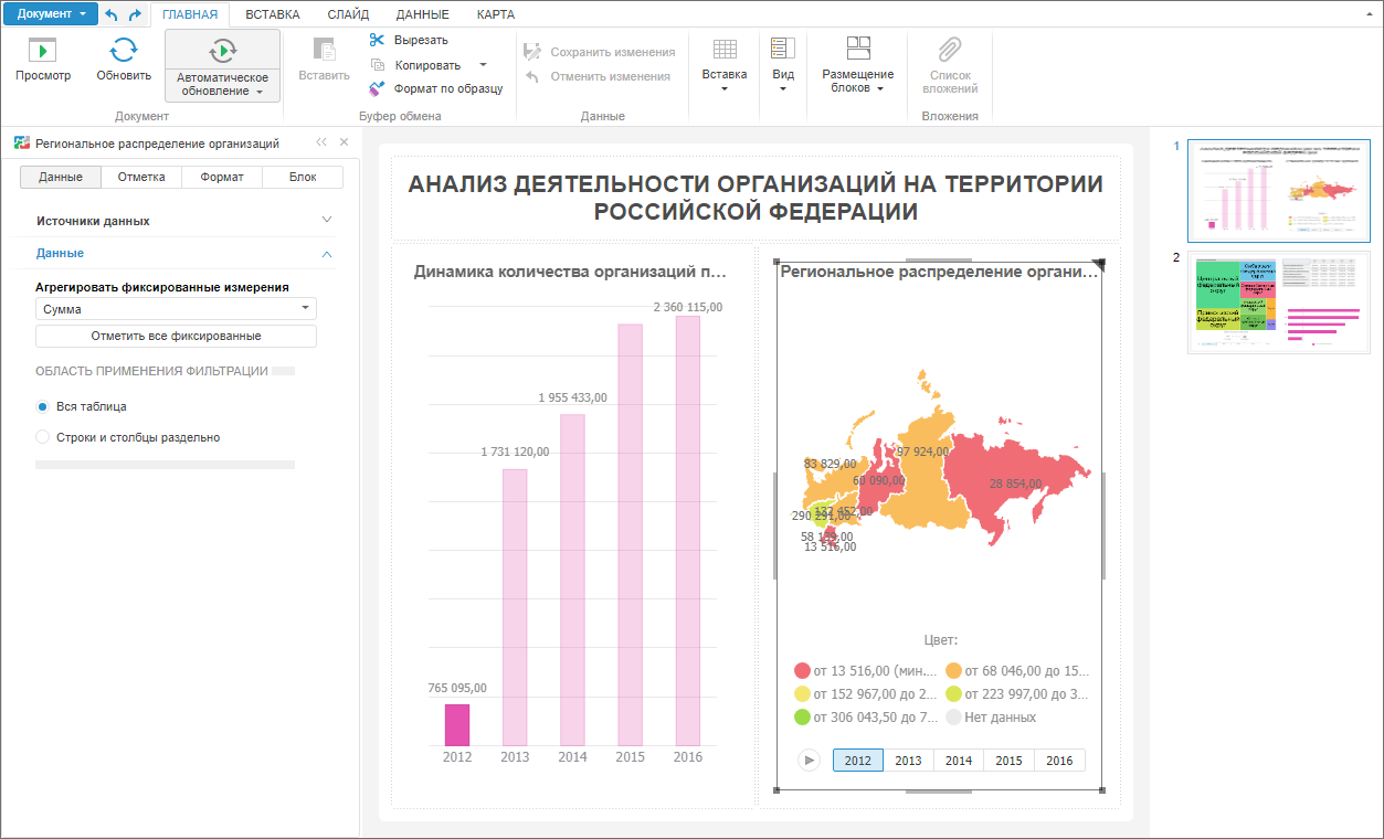 Слайд - это отдельная страница аналитической панели, наполненная различными блоками и иллюстрирующая отдельный раздел информации. Последовательный просмотр слайдов позволяет осветить представляемый объект со всех сторон.