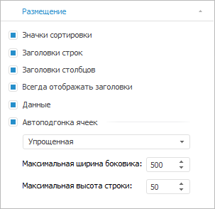 Заголовки столбцов. Определяет, отображать ли шапку таблицы. По умолчанию флажок установлен, шапка отображается;