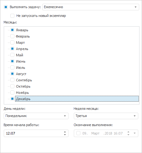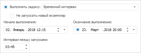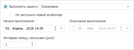 Дата окончания/Окончание выполнения. Задаёт дату последнего выполнения задачи, если установлен флажок «Установить дату и время окончания». В настольном приложении установка флажка «Окончание выполнения» позволяет задать дату и время последнего выполнения задачи, после наступления которых задача не будет больше запускаться на выполнение. По умолчанию настройка не активна;