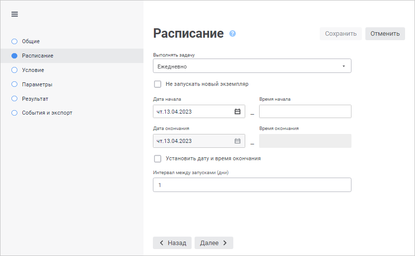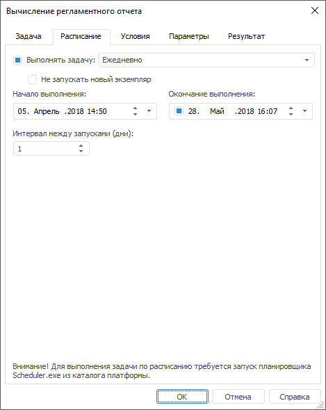 Расписание для выполнения задачи не задано. Вариант доступен для выбора с целью совмещения функциональности с предыдущими версиями.