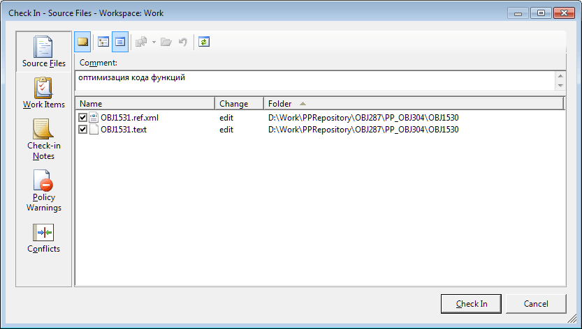 В Team Foundation Server публикация изменений объектов на сервер выполняется стандартными средствами системы управления версиями. При этом выдается запрос на сохранение внесенных изменений и после положительного ответа открывается стандартное окно для публикации изменений объектов на сервер.
