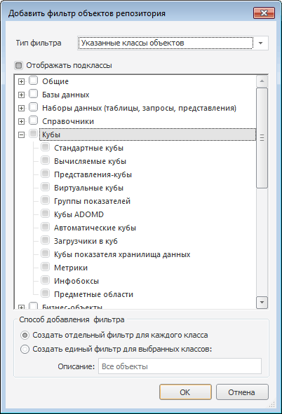 В дереве классов необходимо отметить флажки у тех классов объектов, которые будут доступны при использовании данного фильтра. Флажок «Отображать подклассы» позволяет исключить из дерева отображение дополнительных классов объектов.