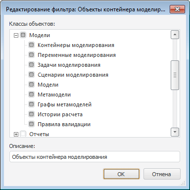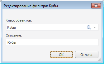 В диалоге можно изменить класс (подкласс, либо их комбинацию для составного фильтра) объекта(ов), для которого создан фильтр, а также описание фильтра. После нажатия кнопки «ОК» изменения будут сохранены.