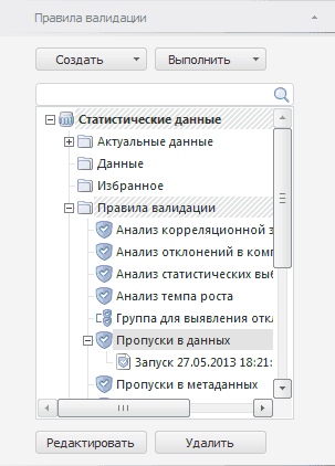 В инструменте анализа временных рядов валидация данных выполняется с помощью правил валидации. Для последовательного выполнения нескольких правил валидации они могут быть объединены в группу.