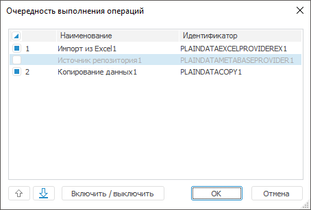 Для выполнения задачи ETL можно включить/выключить цепочки операций и отдельные объекты рабочей области: