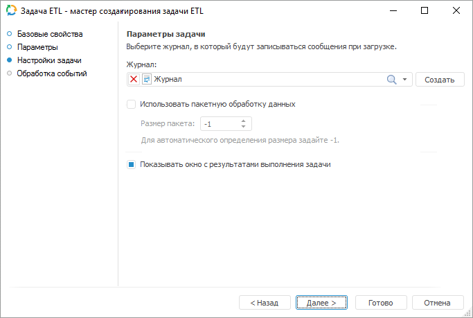 Журнал. В раскрывающемся списке объектов репозитория выберите журнал, в который будут записываться системные сообщения о ходе процессов импорта/экспорта данных в задаче ETL. Кнопка «Создать» позволяет создать новый журнал и отредактировать его структуру;