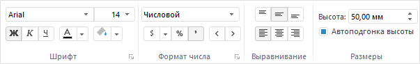 Для настройки внешнего вида заголовка используйте группы команд «Шрифт», «Формат числа», «Выравнивание», «Размеры», расположенные на вкладке «Заголовок» ленты инструментов:
