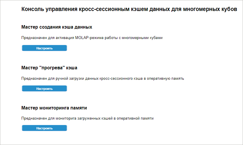 Для создания кэша данных и выбора объекта кэширования нажмите кнопку «Настроить» в области мастера создания кэша на стартовой странице консоли.