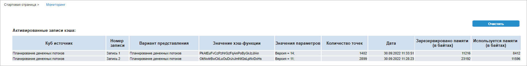 На странице будет отображён список записей кэша, которые в текущий момент загружены в память. Для очистки матрицы с данными у какой-либо записи кэша выделите её и нажмите кнопку «Очистить». Сама запись при этом остаётся загруженной, но количество точек для неё будет равно нулю.