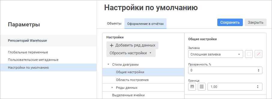 Для настройки стилей диаграмм в отчётах используйте группу параметров «Стили диаграммы» в области «Настройки» и задайте параметры: