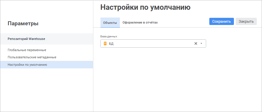 Примечание. В веб-приложении в настройках по умолчанию доступно задание объектов репозитория и настройка оформления в отчётах.