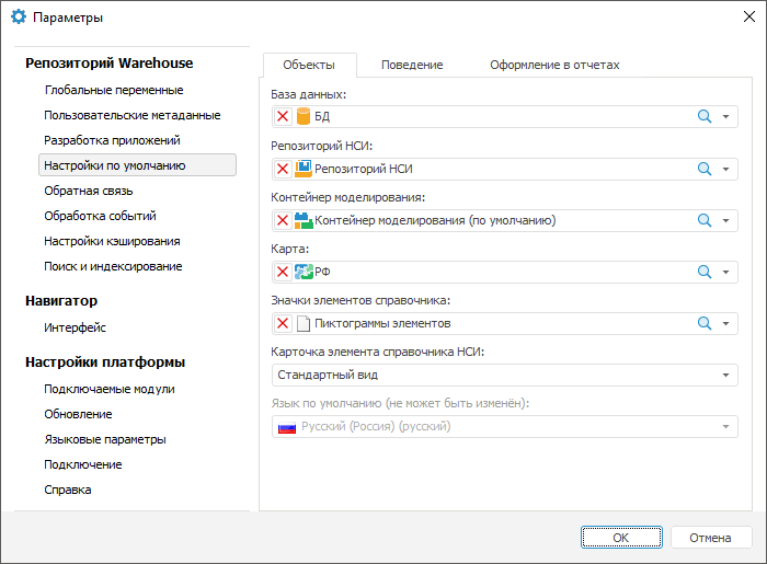 Для задания объектов репозитория по умолчанию используйте вкладку «Объекты».