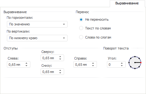 На вкладке «Выравнивание» задаются способы расположения значения внутри ячейки. Значение может быть выровнено по горизонтали и по вертикали с учётом заданных отступов от границ ячейки и угла поворота. Для строковых значений дополнительно может быть задан способ переноса.