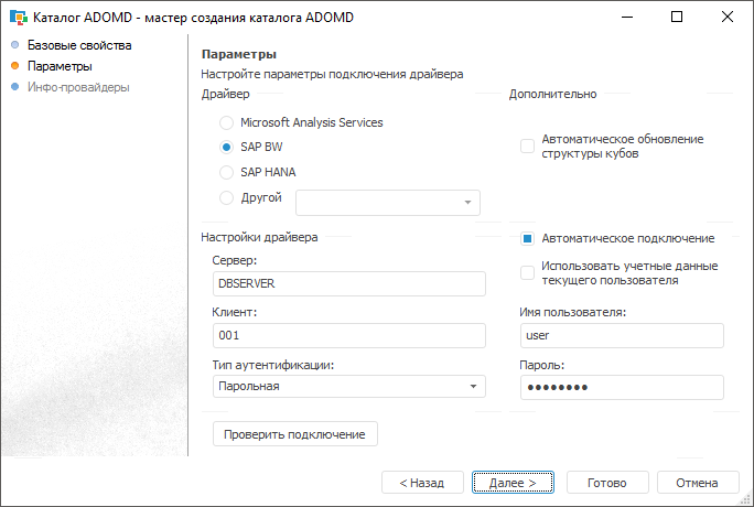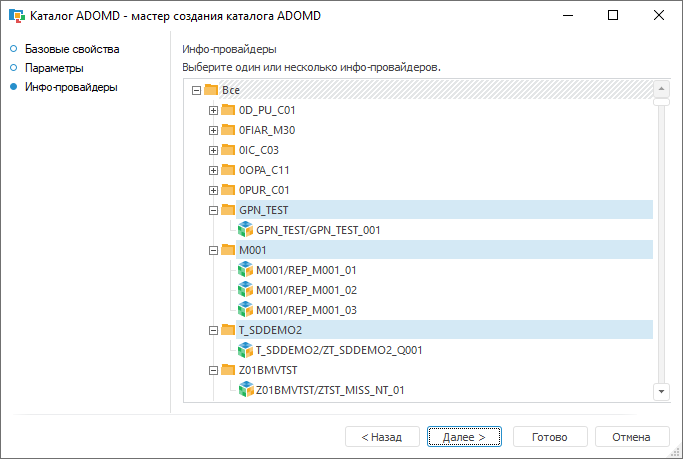 1. Нажмите кнопку «Проверить подключение». При успешном подключении нажмите кнопку «Далее» для перехода к странице «Инфо-провайдеры». На данной странице можно выбрать каталоги или инфо-провайдеры, на основании информации которых будут создаваться объекты в каталоге ADOMD. По умолчанию выделен элемент «Все», при этом будут созданы все кубы, которые созданы на сервере. При необходимости список создаваемых объектов можно сократить, для этого выделите необходимые каталоги или отдельные инфо-провайдеры. Список выделенных объектов сохраняется, при обновлении содержимого каталога ADOMD будет обновлена информация только о выделенных объектах.