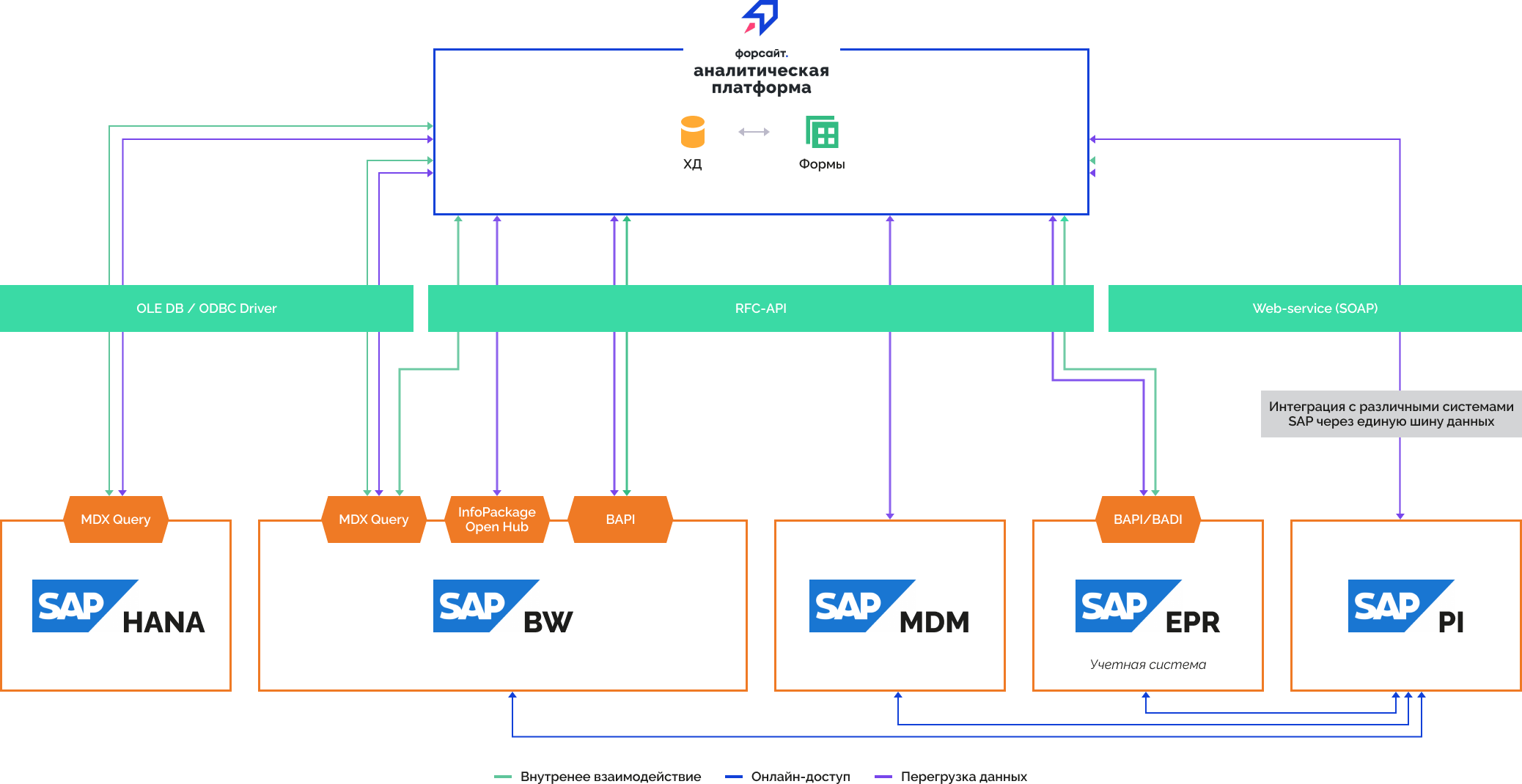 Продукт «Форсайт. Аналитическая платформа» позволяет настроить взаимодействие с различными продуктами и платформами SAP. В общем виде схема интеграции выглядит следующим образом: