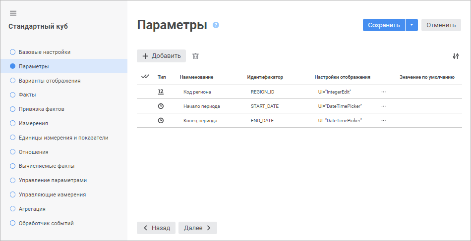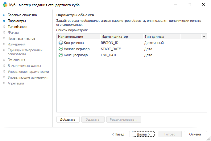 На странице «Параметры» задаётся список параметров объекта. Параметры позволяют формировать содержимое объекта динамически.