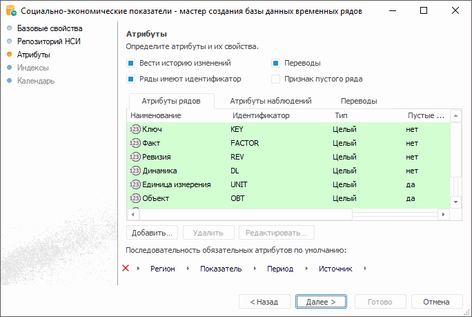 По умолчанию база данных временных рядов уже содержит минимальный набор системных атрибутов рядов и системных атрибутов наблюдений. Они подсвечены зелёным цветом и их удаление запрещено.