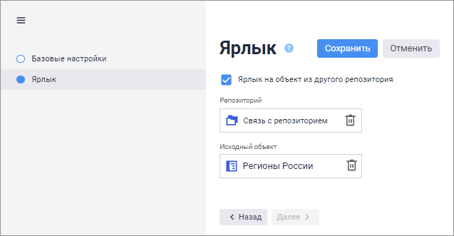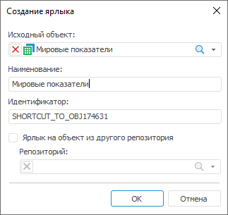Примечание. Если объект, на который ссылается ярлык, находится в другом репозитории, то в раскрывающемся меню «Исходный объект» в качестве корневой папки указывается «Связь с репозиторием».