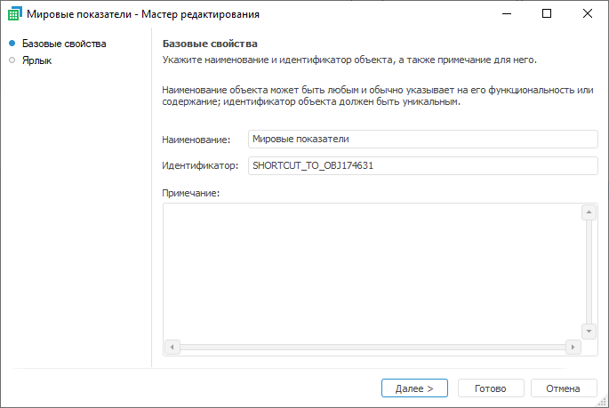 Мастер содержит страницы «Базовые свойства» и «Ярлык».