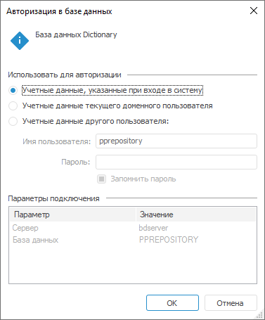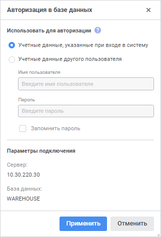 Диалог «Авторизация в базе данных» появляется при подключении к базе данных: