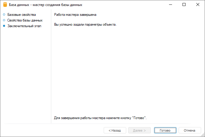 На странице «Свойства базы данных» указывается тип системы управления базами данных (СУБД), установленной на сервере, а также дополнительные параметры подключения.