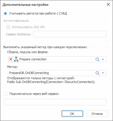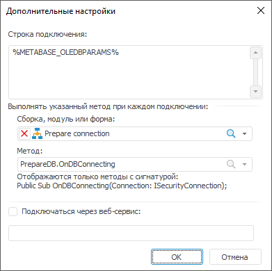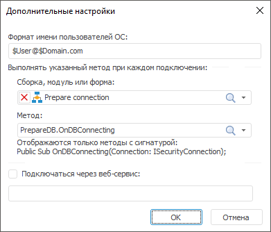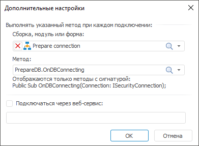 Сборка, модуль или форма. Вне зависимости от типа используемой СУБД можно определить макрос, который будет выполняться при каждом подключении. Для этого из раскрывающегося списка выберите модуль/форму/сборку, где имеется реализация макроса. При этом в раскрывающемся списке «Метод» будет сформирован список доступных для использования методов. Доступными для использования являются статические процедуры, имеющие только один параметр с типом ISecurityConnection: