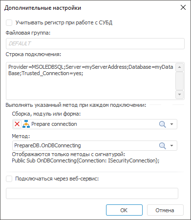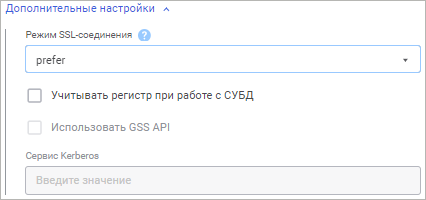 После выполнения одного из действий раскрыт набор параметров «Дополнительные настройки» в веб-приложении или будет открыто окно «Дополнительные настройки» в настольном приложении. Набор параметров зависит от выбранного типа клиента СУБД, который используется для подключения к базе данных: