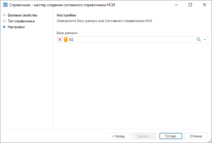Настройки. Выбирается база данных для хранения данных справочника.