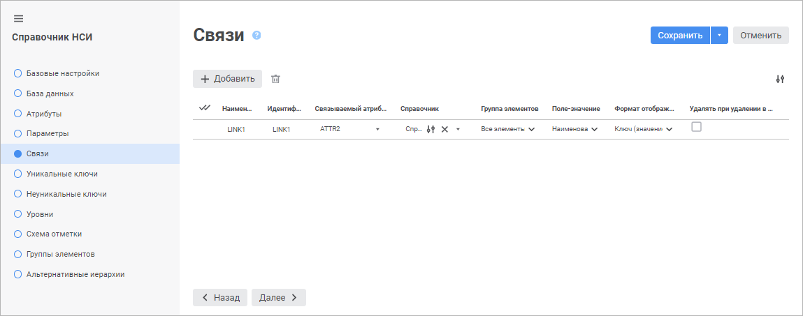 Для создания и настройки связей по атрибутам с другими справочниками НСИ перейдите на страницу «Связи» мастера справочника:
