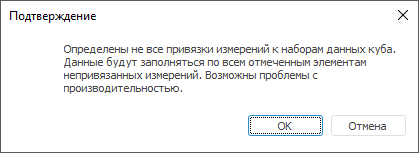 Если в кубе имеются непривязанные измерения, то при переходе со страницы «Измерения» на следующую страницу мастера отобразится сообщение о том, что в измерениях заданы не все привязки. Пример сообщения в настольном приложении: