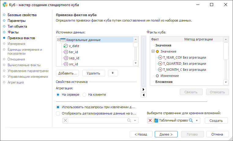 На странице «Привязка фактов» происходит привязка полей источников данных к фактам куба.