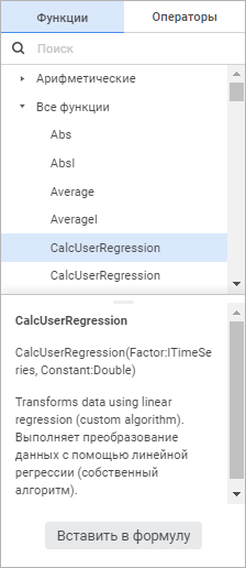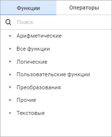 Для быстрого поиска функции или оператора начните вводить функцию/оператор частично или целиком в строке поиска. После выполнения действия на панели функций и операторов будут отображены функции/операторы, удовлетворяющие условиям поиска.
