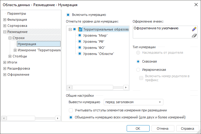 Примечание. Если для области данных установлены методы сортировки «По уровням иерархии» и «С нарушением иерархии», то визуально иерархия будет нарушена. Поэтому иерархическая нумерация заменяется на глобальную сквозную.