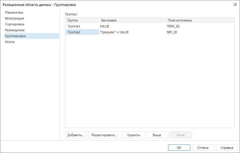 Для настройки параметров группировки реляционной области данных перейдите на вкладку «Группировка» окна «Реляционная область данных»: