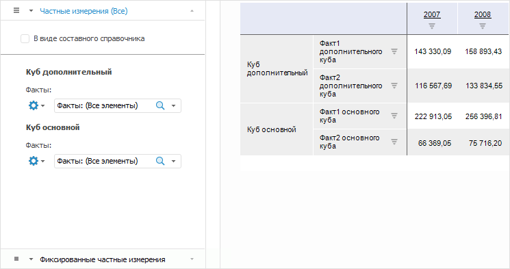 Например, у источников данных отчёта есть по одному уникальному измерению, которое содержит факты куба. Расположив частные измерения в столбцах, мы получим отчёт с чётким разделением данных по источнику: