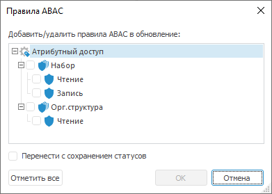 Для сохранения в обновлении статусов элементов атрибутного доступа установите флажок «Перенести с сохранением статусов». Статус определяет разрешение на выполнение проверки доступа существующим элементом и задается с помощью флажков напротив элементов структуры атрибутного доступа в менеджере безопасности. При обновлении структуры атрибутного доступа будут обновлены статусы элементов структуры. Статусы правил будут перенесены вместе с соответствующей политикой.