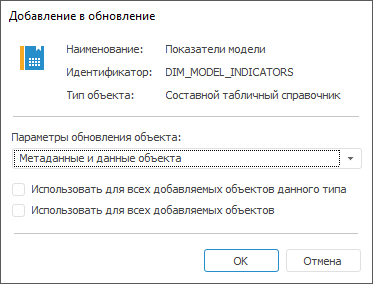 При добавлении в обновление табличных наборов данных (таблицы, присоединенной таблицы, журнала), справочника НСИ, автоматического куба или базы данных временных рядов будет открыто окно «Добавление в обновление»:
