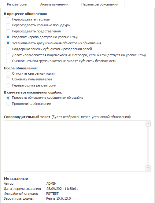 Устанавливать дату изменения объектов из обновления. По умолчанию флажок снят. После установки обновления даты изменения объектов, содержащихся в обновлении, будут соответствовать дате установке обновления. При установленном флажке даты изменения обновляемых объектов будут соответствовать реальным датам изменения объектов в репозитории на момент формирования обновления;