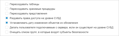 Раздавать права доступа на уровне СУБД. Если в обновлении был настроен перенос прав доступа для одного или нескольких объектов, то возможно потребуется обновление прав доступа на уровне СУБД. Установка флажка позволяет при установке обновления сообщить об этом и при положительном ответе произвести обновление прав доступа на уровне СУБД. При снятом флажке при установке обновления права будут применены только на уровне платформы, для применения прав доступа на уровне СУБД необходимо будет произвести обновление пользователей;