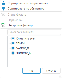 Первые две строки содержат способы сортировки: «Сортировать по возрастанию» и «Сортировать по убыванию». При установленной сортировке направление сортировки отображается в заголовке соответствующего столбца.