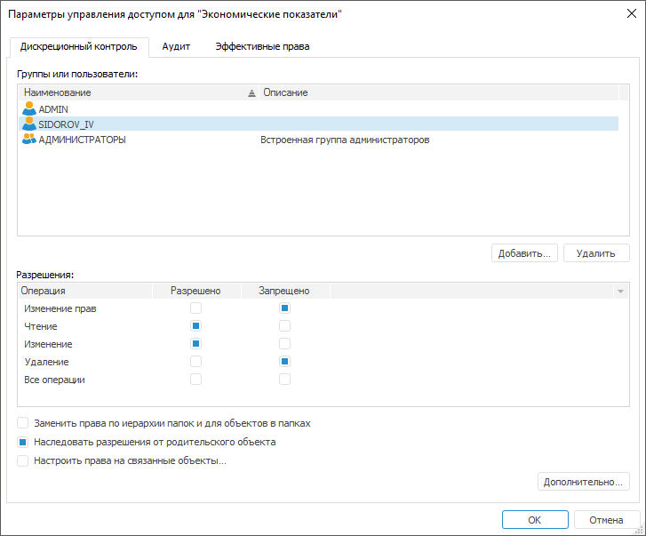 Настройка параметров при дискреционном контроле позволяет определить набор действий пользователя или группы пользователей для работы с объектом.