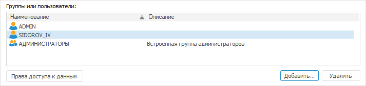 Если диалог настольного приложения «Параметры управления доступом» вызван для базы данных временных рядов, то под списком субъектов безопасности будет отображена кнопка «Права доступа к данным»: