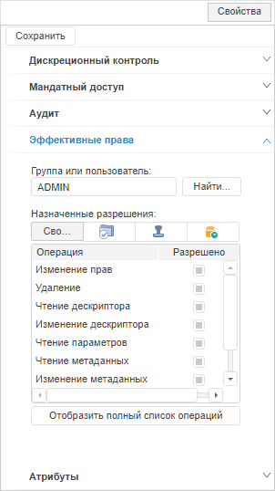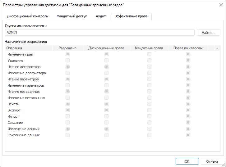 Примечание. Просмотр эффективных прав доступен только для одного выбранного объекта, если используется хотя бы один метод разграничения доступа.