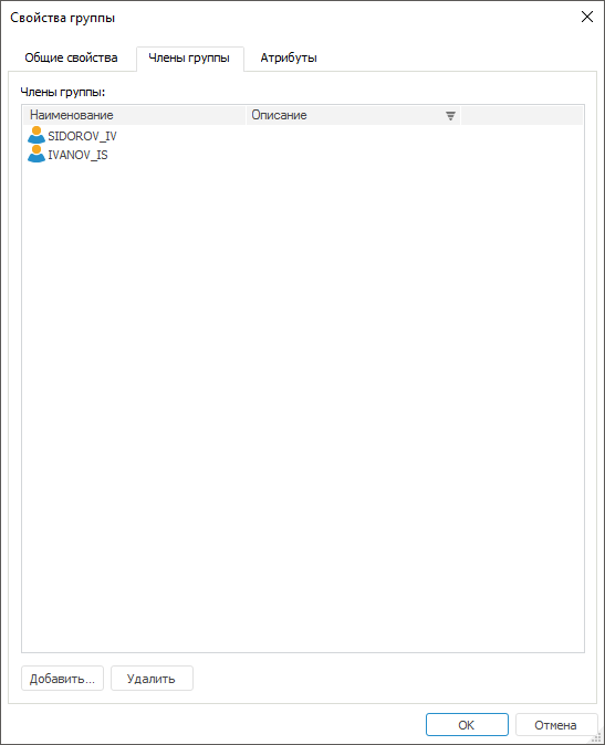 Примечание. Добавление и удаление пользователей из группы доступно пользователям, обладающим привилегией «Изменение прав пользователей, раздача ролей, изменение политики».