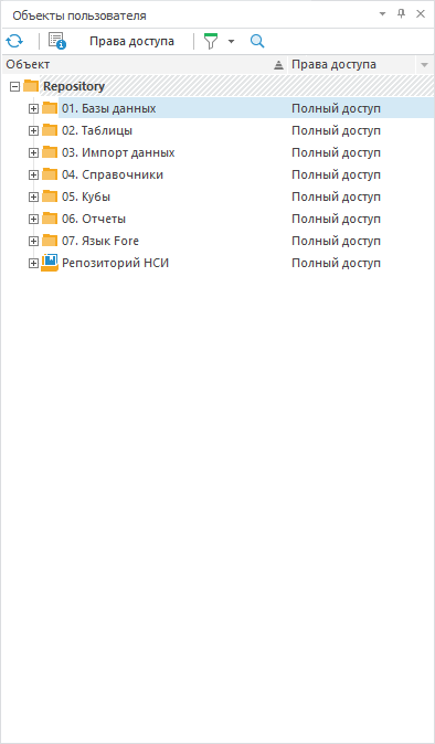 В дереве объектов отображается столбец «Права доступа», содержащий права доступа, которые есть у выбранного пользователя/группы пользователей на конкретный объект.