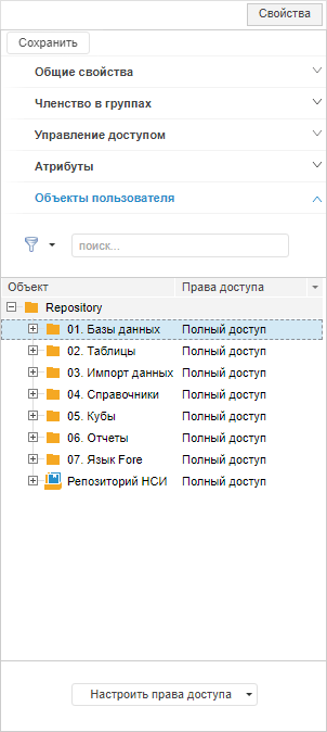 Для удобного просмотра прав доступа пользователя или группы пользователей на объекты репозитория выберите одного пользователя/группу пользователей в разделе «Пользователи» или «Группы». Если выбрано несколько пользователей/групп пользователей, то панель будет пуста.