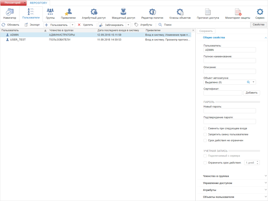 Примечание. При разделении ролей между администратором информационной безопасности и прикладным администратором в разделе «Пользователи» администратору информационной безопасности будут недоступны операции создания, обновления (при определенных условиях) и удаления пользователей, а прикладному администратору недоступны операции смены пароля пользователя и отключения подключенного пользователя.