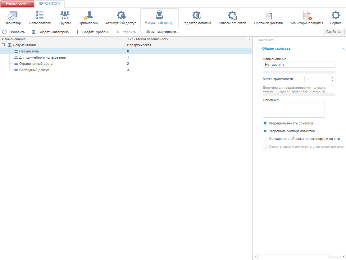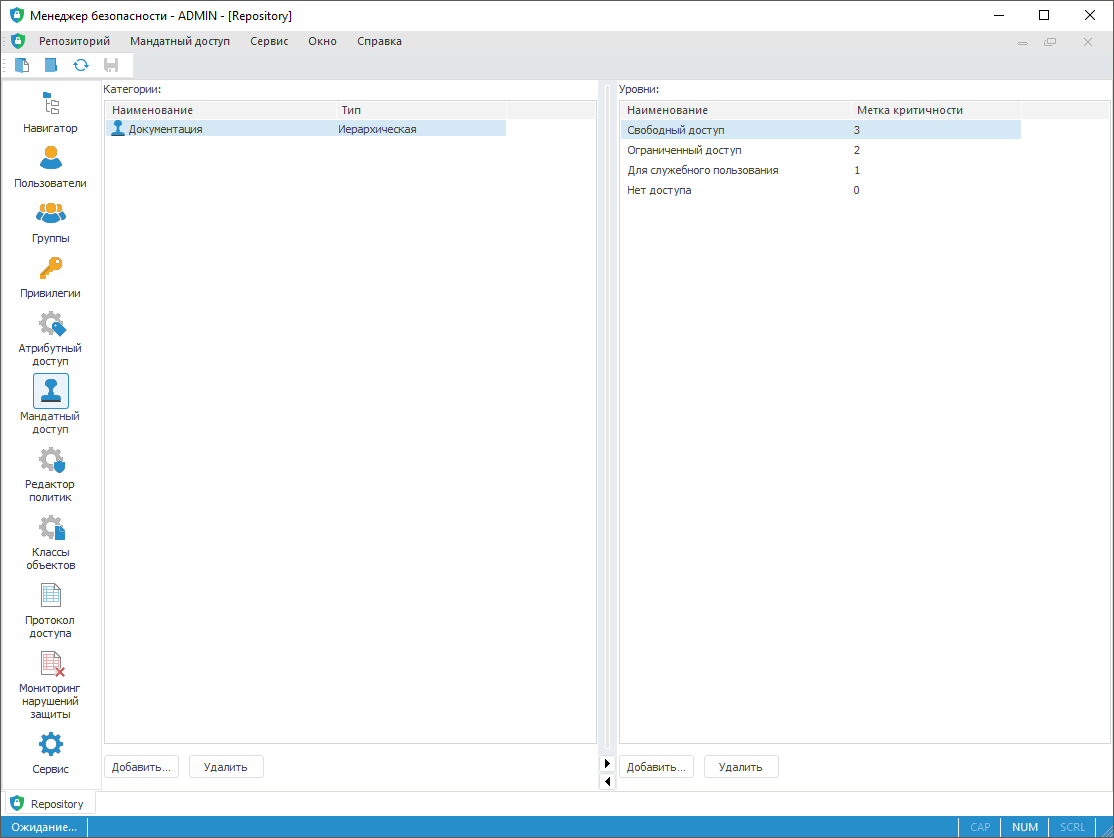 Для добавления категорий и уровней безопасности используйте раздел «Мандатный доступ» панели навигации.