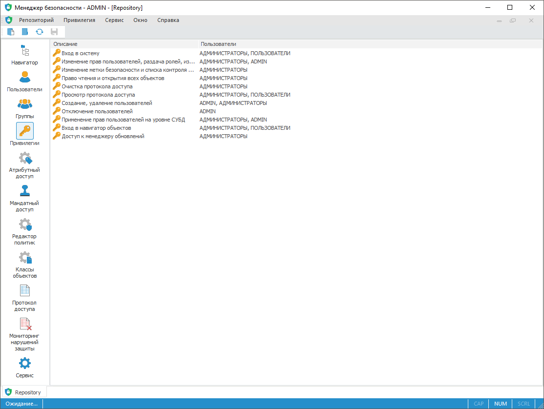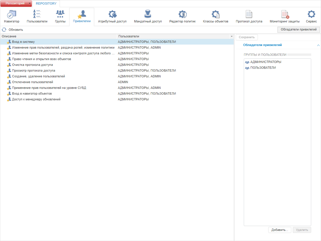 Примечание. При разделении ролей между администратором информационной безопасности и прикладным администратором раздел «Привилегии» будет доступен только администратору информационной безопасности.