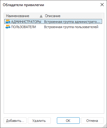 После выполнения одного из действий будет открыто окно «Обладатели привилегий»: